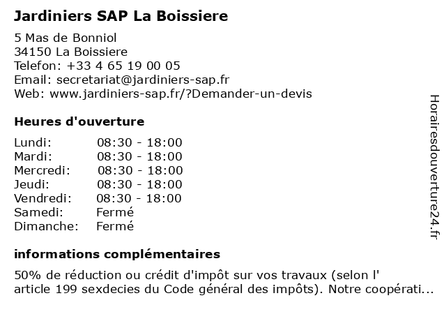 1 Jardiniers SAP La Boissiere (Distance: 3,28 km) 12 Chemin des Moulières, 34150 La Boissiere boissiere, jardiniers, la, sap 2 Jardiniers SAP Cournonterral (Distance: 11,46 km) 8 Impasse Treboulon, 34660 Cournonterral cournonterral, jardiniers, sap 3 Jardiniers SAP Cournonterral (Distance: 11,46 km) 8 Impasse Treboulon, 34660 Cournonterral cournonterral, jardiniers, sap 6  |