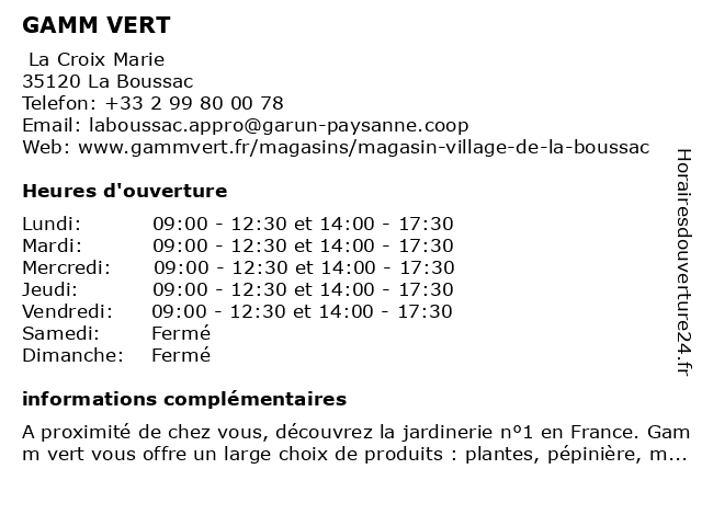 1 Gamm Vert (Distance: 19,33 km) 2 Rue des Blés d'Or, 35540 Miniac-Morvan animalerie, animaux, gamm, horticulteur, jardin, jardinerie, vert 2 Gamm vert (Novembre à Février ) (Distance: 6,77 km) . LES ROLANDIERES, 35120 DOL DE BRETAGNE animalerie, animaux, février, gamm, horticulteur, jardin, jardinerie, novembre, vert 3 Gamm vert (Mars à Octobre ) (Distance: 6,77 km) . LES ROLANDIERES, 35120 DOL DE BRETAGNE animalerie, animaux, gamm, horticulteur, jardin, jardinerie, mars, octobre, vert 4 Votre Point Vert - d'octobre à février (Distance: 7,63 km) n/a Rue Pierre Sémard, 35120 DOL DE BRETAGNE animals, clothing, d'octobre, flower market, février, garden, garden tools, interior, pet, point, vert, votre 5 Votre Point Vert - de mars à septembre (Distance: 7,63 km) n/a Rue Pierre Sémard, 35120 DOL DE BRETAGNE animals, clothing, de, flower market, garden, garden tools, interior, mars, pet, point, septembre, vert, votre 6 Votre Point Vert (Distance: 11,22 km) 20 Bd Clémenceau, 50170 PONTORSON animals, clothing, flower market, garden, garden tools, interior, pet, point, vert, votre |