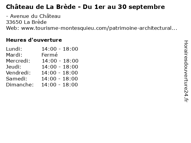 1 Château de La Brède - Du 25 avril au 31 mai (Distance: 0,00 km) - Avenue du Château, 33650 La Brède 25, 31, ancien, art, au, avril, brède, chateau, château, de, du, la, mai, musee 2 Château de La Brède - Du 1er au 30 juin (Distance: 1,10 km) - Avenue du Château, 33650 La Brède 1er, 30, ancien, art, au, brède, chateau, château, de, du, juin, la, musee 3 Ecole de Conduite Albert 1er (Distance: 15,24 km) 17 Boulevard Albert 1er, 33800 Bordeaux 1er, albert, auto, code, conduite, de, ecole, permis 4 Château de Cadillac - Du 1er Juin Au 30 Septembre (Distance: 17,30 km) 4 Place de la Libération, 33410 Cadillac-sur-Garonne 1er, 30, ancien, art, au, cadillac, chateau, château, de, du, juin, musee, septembre 5 Château de Cadillac - Du 1er Octobre Au 31 Décembre (Distance: 17,30 km) 4 Place de la Libération, 33410 Cadillac-sur-Garonne 1er, 31, ancien, art, au, cadillac, chateau, château, de, du, décembre, musee, octobre 6 Offices de Tourisme - Cadillac (Pâques au 30/06) (Distance: 17,33 km) 8 Rue du Général-de-Gaulle, 33410 Cadillac 30/06, au, bureaux, cadillac, de, offices, pâques, services, tourisme |