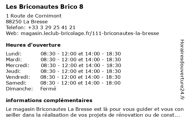| Samedi | 08:30-12:00 et 14:00-18:00 |