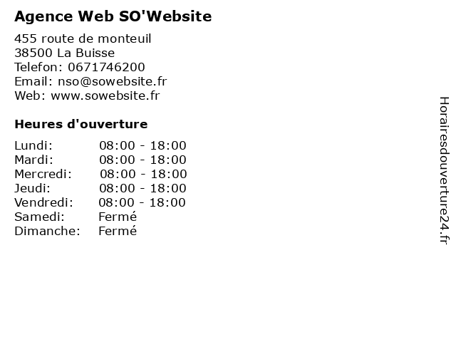 1 agence de communication web sowebsite (Distance: 0,00 km) 455 route de monteuil, 38500 La buisse agence, communication, création de site internet, de, graphisme, référencement naturel, sowebsite, web 2 WMC - Web Media Com (Distance: 2,70 km) 5 rue Alphonse Bouffard-Roupé, 38500 Voiron com, concepteur, création, media, site, web, wmc 4 So Food Snack (Distance: 6,12 km) 54 Grande Rue, 38340 Voreppe food, restauration, sandwicherie, snack, so 5 Oxiwiz - Agence Web (Distance: 7,05 km) 80 Espace 3 fontaines, 38140 Rives agence, communication, oxiwiz, rives, web 6 So K Coiffure (Distance: 17,68 km) 91 Route de Grenoble, 38690 Châbons barbier, chevaux, coiffeur, coiffure, coloration, coupe, so |