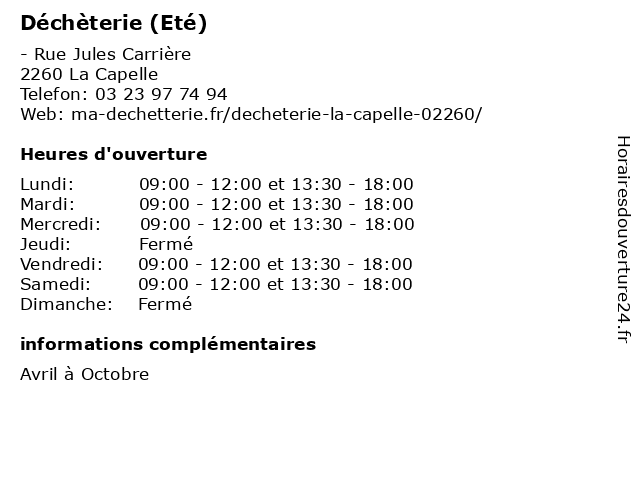 1 Déchèterie (Eté) (Distance: 16,78 km) - Rue Enguerand de Coucy, 02140 Vervins avril, débarras, déchets, déchèterie, eté, octobre, poubelles 2 Déchèterie (Hiver) (Distance: 0,00 km) - Rue Jules Carrière, 02260 La Capelle débarras, déchets, déchèterie, hiver, mars, novembre, poubelles 3 Déchèterie (Eté ) (Distance: 9,86 km) - Marlière, 59610 Fourmies déchèterie, eté, gravats, huiles usées, la réception des déchets et écocentres, les appareils électroménagers, les déchets verts, papier et carton en quantité 4 Déchèterie (Hiver) (Distance: 9,86 km) - Marlière, 59610 Fourmies déchèterie, gravats, hiver, huiles usées, la réception des déchets et écocentres, les appareils électroménagers, les déchets verts, papier et carton en quantité 5 Déchèterie (Hiver) (Distance: 11,43 km) - Rue de Boué, 02170 Nouvion-en-Thiérache déchèterie, gravats, hiver, huiles usées, la réception des déchets et écocentres, les appareils électroménagers, les déchets verts, mars, novembre, papier et carton en quantité 6 Déchèterie (Eté ) (Distance: 14,92 km) - Rue poncheau, 59440 Avesnelles déchèterie, eté, gravats, huiles usées, la réception des déchets et écocentres, les appareils électroménagers, les déchets verts, papier et carton en quantité |