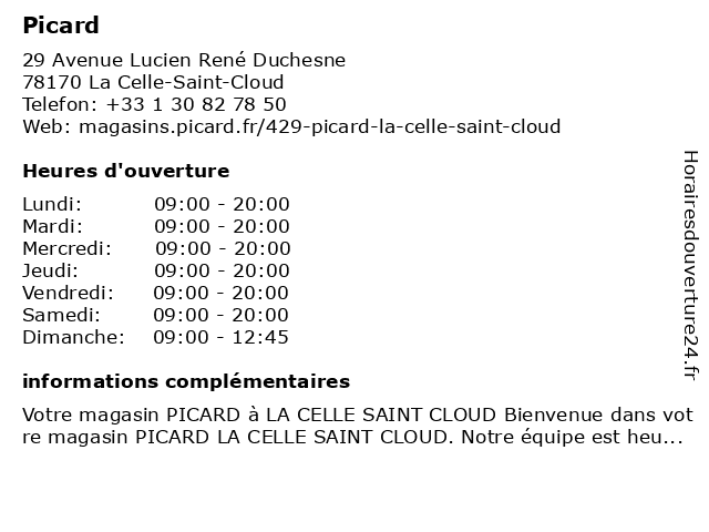 Votre magasin PICARD à LA CELLE SAINT CLOUD Bienvenue dans votre magasin PICARD LA CELLE SAINT CLOUD. Notre équipe est heureuse de vous accueillir et pourra vous conseiller avec professionnalisme...