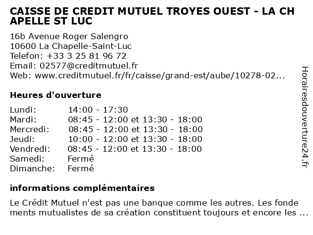 Termes de recherche pour CAISSE DE CREDIT MUTUEL TROYES OUEST - LA CHAPELLE ST LUC:la, de, st, chapelle, luc, troyes, crédit, ouest, mutuel, caisse |