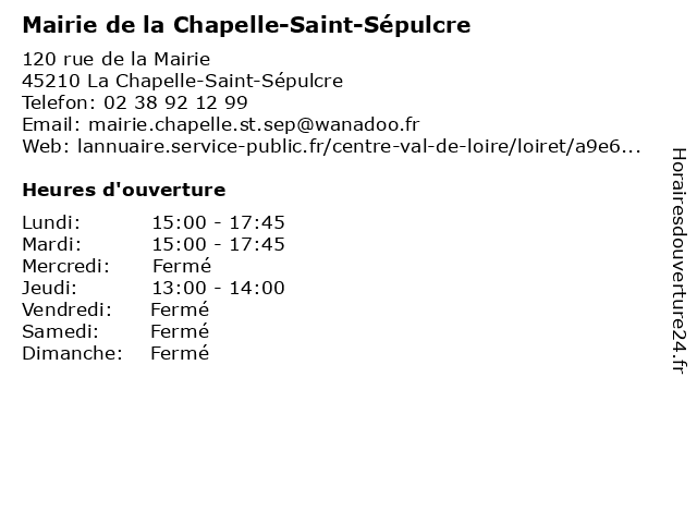 Termes de recherche pour Mairie de la Chapelle-Saint-Sépulcre:la, de, saint, chapelle, administration, mairie, sépulcre, service public |