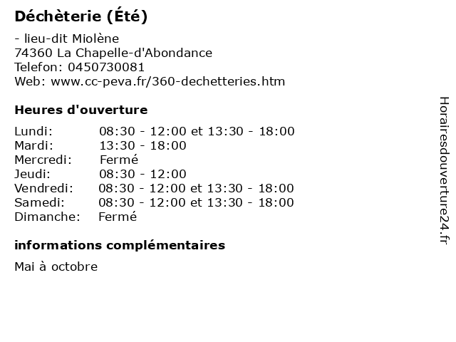 1 Déchèterie (Été) (Distance: 8,04 km) - La Revenette, 74360 Vacheresse bennes, déchets, déchèterie, détritus, gravats, été 2 Déchèterie (Été) (Distance: 11,02 km) - Champ de Foire, 74500 Bernex 15/05, 30/09, au, du, déchèterie, gravats, huiles usées, la réception des déchets et écocentres, les appareils électroménagers, les déchets verts, papier et carton en quantité, été 3 Déchèterie (Été) (Distance: 14,48 km) - Route de Thollon, 74500 Lugrin bennes, déchets, déchèterie, détritus, gravats, été 4 Déchèterie (Hiver) (Distance: 0,00 km) - lieu-dit Miolène, 74360 La Chapelle-d'Abondance bennes, déchets, déchèterie, détritus, gravats, hiver 5 Sherpa (été ) (Distance: 5,51 km) - Résidence Snailles, 74390 Chatel fondue ou pierre à griller, la commande en ligne, le prêt d’appareils à raclette, marche, sherpa, supermarche, été 6 Sherpa (été ) (Distance: 11,73 km) - Les sapins - Station, 74500 Thollon les mémises fondue ou pierre à griller, la commande en ligne, le prêt d’appareils à raclette, marche, sherpa, supermarche, été |