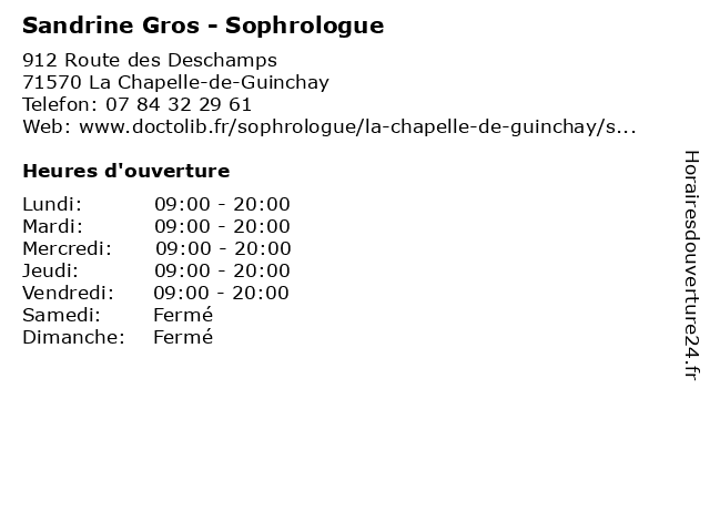 1 Sandrine Viallon Maquart - Sage femme (Distance: 5,11 km) 50 Rue de la Brancionne, 71680 Crêches-sur-Saône consultation, docteur, femme, maquart, med, médecin, médecine, sage, sandrine, traitement, viallon 2 Dr Sandrine Aurelle - Médecin généraliste (Distance: 11,22 km) 170 Rue du Parc Saint-Jean, 69220 Belleville-en-Beaujolais aurelle, docteur, dr, generaliste, généraliste, medical, médecin, sandrine, soin 3 Sandrine Boudigues - Psychologue (Distance: 11,70 km) - Rue de la république, 69220 Belleville-en-Beaujolais boudigues, psy, psychiatre, psychologue, sandrine, sante, soins 4 Agnès Chamarande - Sophrologue (Distance: 11,80 km) 61b Rue de la République, 69220 Belleville-en-Beaujolais agnès, chamarande, medecin, sante, sophro, sophrologue 5 Fringues & Nous by Sandrine (Distance: 12,19 km) 12 Rue de l'Héritan, 71000 Mâcon by, fringues, nous, sandrine 6 Sandrine Billiotte-Pertinand (Distance: 12,34 km) 10 Rue des Ursulines, 71000 Mâcon billiotte, pertinand, sandrine  |