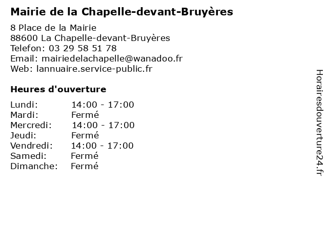 | Termes de recherche pour Mairie de la Chapelle-devant-Bruyères:la, de, bruyeres, chapelle, administration, mairie, assoc public, devant |