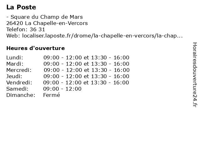 2 La Poste (Distance: 3,70 km) - Le Village, 26420 Saint-Agnan-en-Vercors agence, assurance, banque, banque postale, bureau de poste, chronopost, colis, courrier, dps, expéditions internationales, la, point, postale, poste, relais, timbres, téléphonie, ups, western union 3 La Poste (Distance: 6,33 km) 10 Place du Tilleul, 26420 Saint-Martin-en-Vercors agence, assurance, banque, banque postale, bureau de poste, chronopost, colis, courrier, dps, expéditions internationales, la, point, postale, poste, relais, timbres, téléphonie, ups, western union 4 La Poste (Distance: 8,75 km) - Avenue Georges Magnat, 26420 Vassieux-en-Vercors agence, colis, courriers, expédition, la, postale, poste, relais 5 La Poste (Distance: 9,68 km) - Le Village, 26420 Saint-Julien-en-Vercors agence, assurance, banque, banque postale, bureau de poste, chronopost, colis, courrier, dps, expéditions internationales, la, point, postale, poste, relais, timbres, téléphonie, ups, western union 6 La Poste (Distance: 11,93 km) 127 Route de Pont-en-Royans, 38680 Rencurel agence, assurance, banque, banque postale, bureau de poste, chronopost, colis, courrier, dps, expéditions internationales, la, point, postale, poste, relais, timbres, téléphonie, ups, western union |