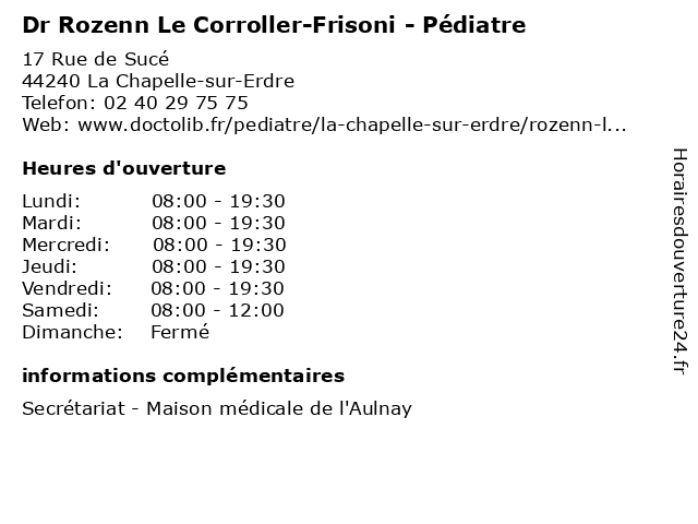 1 Dr Marie-Line Poitevin - Pédiatre (Distance: 0,00 km) 17 Rue de Sucé, 44240 La Chapelle-sur-Erdre docteur, dr, generaliste, line, marie, medical, poitevin, pédiatre, soin 2 Dr Marie-Claude Bonhomme - Pédiatre (Distance: 6,38 km) 2-4 route de Paris, 44300 Nantes bonhomme, claude, consultation, docteur, dr, marie, med, médecin, médecine, pédiatre, traitement 3 Dr Bénédicte Zboril-Berteaud - Pédiatre (Distance: 6,38 km) 2-4 route de Paris, 44300 Nantes benedicte, berteaud, bénédicte, consultation, docteur, dr, med, médecin, médecine, pédiatre, traitement, zboril 4 Dr Caroline Hostein - Pédiatre (Distance: 6,38 km) 2-4 route de Paris, 44300 Nantes caroline, consultation, docteur, dr, hostein, med, médecin, médecine, pédiatre, traitement 5 Dr Charlotte Lefaix - Pédiatre (Distance: 6,38 km) 2-4 route de Paris, 44300 Nantes charlotte, consultation, docteur, dr, lefaix, med, médecin, médecine, pédiatre, traitement 6 Dr Catherine Maingueneau - Pédiatre (Distance: 6,38 km) 2-4 route de Paris, 44300 Nantes catherine, consultation, docteur, dr, maingueneau, med, médecin, médecine, pédiatre, traitement |