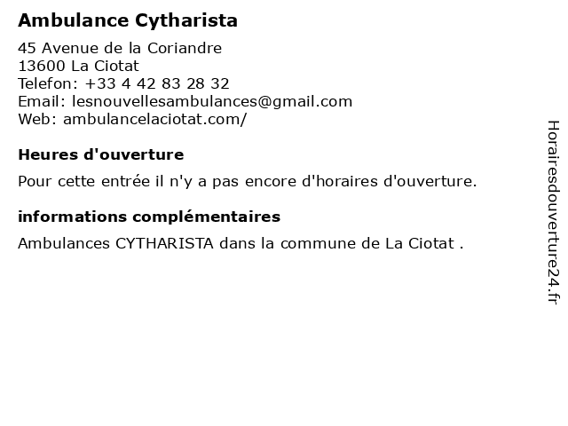 1 Ambulance la Ciotat (Distance: 0,01 km) 45 Avenue de la Coriandre, 13600 La Ciotat ambulance, ciotat, la 3 Sérénité Ambulance (Distance: 11,87 km) Chemin du Bois de l'Aumône, 13011 Aubagne ambulance, sérénité 5 Azur Océane Ambulance (Distance: 13,89 km) 4 Impasse Pierre Loti, 83150 Bandol ambulance, azur, océane 6 Manhattan Ambulance (Distance: 15,95 km) 16 Boulevard de la Pomme, 13011 Marseille ambulance, manhattan |