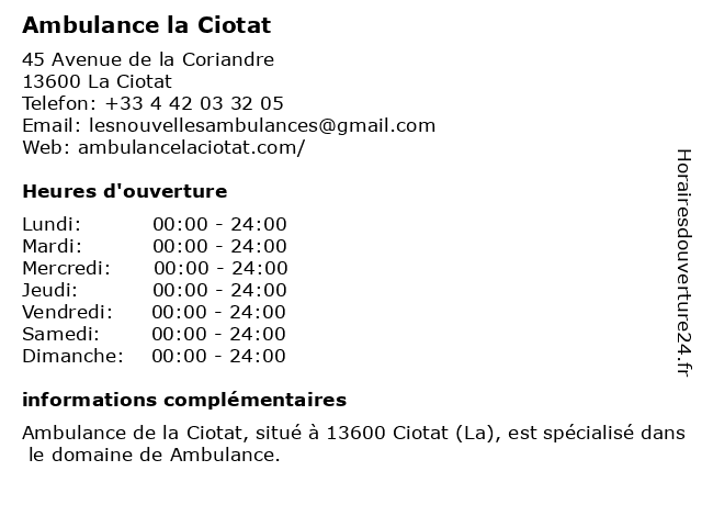 1 Ambulance Cytharista (Distance: 0,01 km) 45 Avenue de la Coriandre, 13600 La Ciotat ambulance, cytharista 3 Sérénité Ambulance (Distance: 11,87 km) Chemin du Bois de l'Aumône, 13011 Aubagne ambulance, sérénité 5 Azur Océane Ambulance (Distance: 13,88 km) 4 Impasse Pierre Loti, 83150 Bandol ambulance, azur, océane 6 Manhattan Ambulance (Distance: 15,96 km) 16 Boulevard de la Pomme, 13011 Marseille ambulance, manhattan |