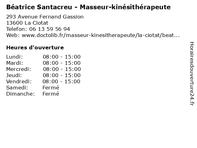 1 Béatrice Chauvin - Ostéopathe (Distance: 1,28 km) 502 Avenue Guillaume Dulac, 13600 La Ciotat béatrice, chauvin, ostéo, ostéopathe, ostéopathes, soins 2 Béatrice Mantout - Hypnothérapeute (Distance: 12,93 km) 22 Rue de la République, 13400 Aubagne béatrice, hypno, hypnose, hypnothérapeute, mantout, sante 3 O Toilettage Canin by Béatrice (Distance: 16,35 km) 38 Boulevard Chanzy, 83330 Le Beausset by, béatrice, canin, canines, chiens, domestiques, toilettage, toiletteurs 4 Béatrice Muller - Naturopathe (Distance: 16,90 km) 83 Boulevard du Redon, 13009 Marseille béatrice, medecin, muller, naturopathe, plante, sante 5 Dr Béatrice Margaillan - Chirurgien-dentiste (Distance: 17,64 km) 249 Rue Pierre Doize, 13010 Marseille béatrice, chirurgien, consultation, dentiste, docteur, dr, margaillan, med, médecin, traitement 6 Dr Béatrice Gravier - Gynécologue obstétricienne (Distance: 18,27 km) 250 Rue de l'Innovation, 83110 Sanary-sur-Mer bebe, béatrice, dr, gravier, gynecologie, gynécologue, maternite, obstetrique, obstétricienne |