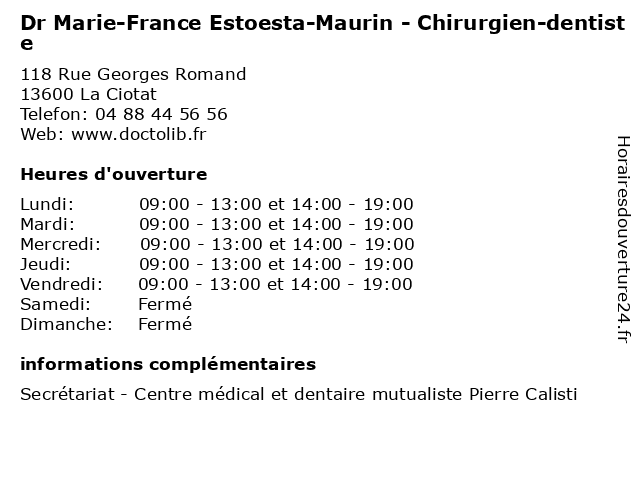 1 Dr Marie-France Estoesta-Maurin - Chirurgien-dentiste (Distance: 19,88 km) 89 Boulevard du Sablier, 13008 Marseille bonneveine, centre, chirurgien, clinique, de, dentaire, dentiste, dr, estoesta, france, implantologie, la, marie, maurin, parodontologie 2 École maternelle publique Bois Maurin (Distance: 12,68 km) 571 Boulevard Du Bois Maurin, 83150 Bandol bois, cours, education, maternelle, maurin, publique, services, école 3 Opel Groupe Maurin (Horaires Service Commercial ) (Distance: 16,89 km) s/n Traverse de la Montre, 13011 Marseille (La Valentine) commercial, groupe, horaires, marseille, maurin, opel, service, services, véhicules 4 Opel Groupe Maurin (Service Après-vente ) (Distance: 16,89 km) s/n Traverse de la Montre, 13011 Marseille (La Valentine) après, groupe, marseille, maurin, opel, service, services, vente, véhicules 5 Marc Maurin - Masseur-kinésithérapeute (Distance: 19,07 km) 20 Boulevard de Pont de Vivaux, 13010 Marseille bien-être, en, forme, kinésithérapeute, kinésithérapie, marc, masseur, maurin, remise, rééducation 6 Dr Thierry Clément - Chirurgien orthopédiste et traumatologue (Distance: 0,00 km) 118 Rue Georges Romand, 13600 La Ciotat calisti, centre, chirurgien, clement, clément, dentaire, dr, et, mutualiste, médical, orthopedie, orthopédique, orthopédiste, pierre, thierry, trauma, traumatologie, traumatologique, traumatologue |