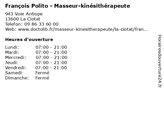 1 Dr François Paolantonacci - Médecin généraliste (Distance: 1,91 km) 211 Chemin de la Pépinière, 13600 La Ciotat docteur, dr, françois, generaliste, généraliste, medical, médecin, paolantonacci, soin 2 Dr François Breton - Chirurgien urologue - secrétariat (Distance: 9,95 km) 33 Boulevard des Farigoules, 13400 Aubagne breton, chirurgien, consultation, docteur, dr, françois, med, médecin, médecine, secrétariat, traitement, urologue 3 Dr. François Portier - Radiologue (Distance: 10,11 km) 179 Avenue des Sœurs Gastine, 13400 Aubagne consultation, docteur, dr., francois, françois, med, médecin, médecine, portier, radiologue, traitement 4 Restaurant René et Jean-François Bérard à l'Hostellerie Bérard - La Cadière-d'Azur (Distance: 12,09 km) 6 avenue Gabriel Péri, 83740 La Cadière-d'Azur boulangers, bérard, cadière, cafes, d'azur, epiceries, et, françois, fromagers, jean, l'hostellerie, la, patisseries, rené, restaurant 5 Collège Public François Villon (Distance: 14,65 km) 18 rue Courencq, 13011 Marseille cio, college, collège, cours, ecole, education, elementaire, enseignement, françois, lycee, maternelle, nationale, orientation, primaire, prive, privee, public, publique, villon 6 François Monchablon - Masseur-kinésithérapeute (Distance: 15,86 km) 83 Boulevard du Redon, 13009 Marseille cabinet, crf, de, françois, kiné, kinésithérapeute, kinésithérapie, la, masseur, monchablon, rouvière, rééducation, soin |