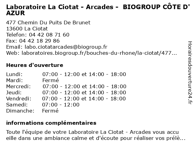 Termes de recherche pour Laboratoire La Ciotat - Arcades - BIOGROUP CÔTE D'AZUR:la, ciotat, laboratoire, arcades, cote, d'azur, biogroup, dépistages, laboratoire de diagnostic |