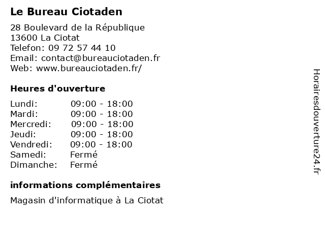 1 Bureau du Service Cimetière (Distance: 0,17 km) 80 rue des Poilus, 13600 La Ciotat bureau, cercueil, cimetiere, cimetière, deuil, du, mort, service 2 Musée Ciotaden - Juillet et Août (Distance: 0,52 km) 1 quai Ganteaume, 13600 La Ciotat 1er, 31, août, au, ciotaden, du, et, exposition, juillet, musée, visite 3 Musée Ciotaden - Septembre à Juin (Distance: 0,52 km) 1 quai Ganteaume, 13600 La Ciotat 1er, 30, au, ciotaden, du, exposition, juin, musée, septembre, visite 4 Bureau de vente Nexity (Distance: 13,87 km) 561 Prom pierre blancard, 13400 AUBAGNE bureau, de, nexity, vente 5 Bureau Information Jeunesse (Distance: 15,65 km) 80 chemin du Rouve, 83330 Le Beausset administration, assoc, beausset, bureau, information, jeunesse, point, services, services publics 6 Le Bureau Municipaux de Proximité (Distance: 16,79 km) 3 Rue du 10 Août, 13011 Marseille bureau, de, le, mairie, municipaux, proximité, services |