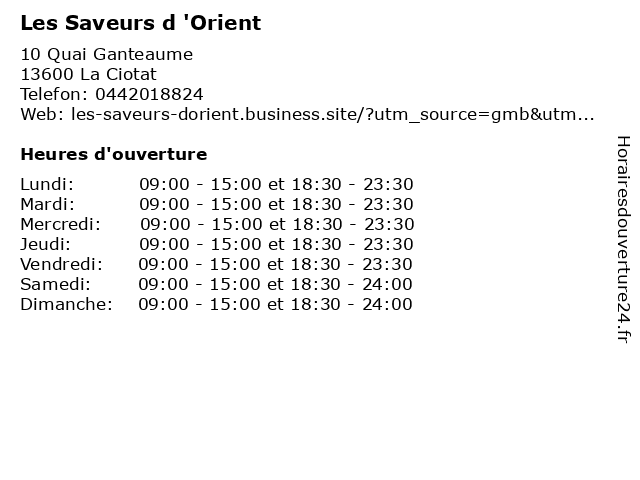 Samedi | 09:00-15:00 et 18:30-24:00 |