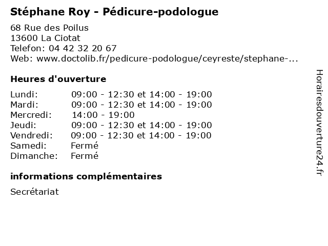 1 Lise Mallet - Pédicure-podologue - secretariat (Distance: 0,14 km) 175 Avenue Victor Hugo,, 13600 La Ciotat lise, mallet, médecin, médecine, médical, pharmaceutique, podologue, pédicure, secretariat, traitement 2 Mélinée Kabakdjian - Pédicure-podologue - secretariat (Distance: 0,15 km) 4 Avenue Valentin Giraud, 13600 La Ciotat kabakdjian, médecin, médecine, médical, mélinée, pharmaceutique, podologue, pédicure, secretariat, traitement 3 Sophie Ciolkovitch - Pédicure-podologue - secretariat (Distance: 0,24 km) - Boulevard Alphonse de Lamartine,, 13600 La Ciotat ciolkovitch, médecin, médecine, médical, pharmaceutique, podologue, pédicure, secretariat, sophie, traitement 4 Agathe Wentzo - Pédicure-podologue (Distance: 0,24 km) - Boulevard Alphonse de Lamartine, 13600 La Ciotat agathe, médecin, médecine, médical, pharmaceutique, podologue, pédicure, secretariat, traitement, wentzo 5 La Savonnerie du Pilon du Roy (Distance: 3,17 km) 1 avenue des Mattes, 13600 La Ciotat divers, docks, du, détail, la, magasins, marseille, nra, pilon, roy, savon, savonnerie 6 Amel Benlefki - Pédicure-podologue (Distance: 11,81 km) 25 Avenue Vincent Negrel, 83740 La Cadière-d'Azur amel, benlefki, orthoplastie, podologue, pédicure, pédicurie |