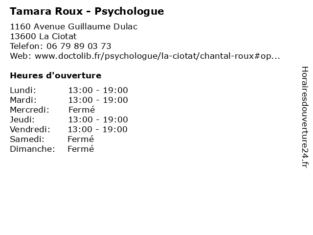 1 Chantal Roux - Psychologue (Distance: 0,00 km) 1160 Avenue Guillaume Dulac, 13600 La Ciotat chantal, psy, psychiatre, psychologue, roux, sante, soins 2 Dr Christine Roux - Médecin généraliste (Distance: 2,08 km) - Traverse des Pénitents Noirs, 13600 La Ciotat christine, consultation, docteur, dr, généraliste, med, médecin, roux, traitement 3 Frédérique Roux-Authier - Psychologue (Distance: 9,70 km) 2495 Chemin de Saint-Come, 83740 La Cadière-d'Azur authier, folie, frédérique, psychiatre, psychiatrie, psychiatrique, psychologue, roux 4 Dr Olivier Roux - Cardiologue (Distance: 11,21 km) 33 Boulevard des Farigoules, 13400 Aubagne cardiologue, consultation, docteur, dr, med, médecin, médecine, olivier, roux, traitement 5 Roux Leonce Henri (Distance: 18,69 km) 40 Rue Beranger, 13012 Marseille bailleurs, biens, henri, immobiliers, leonce, nra, roux 6 Frédérique Roux-Authier - Psychologue - secrétariat (Distance: 19,78 km) 44 Rue Raphaël, 13008 Marseille authier, cabinets, frédérique, médecins, psychologue, roux, secrétariat, thérapies |