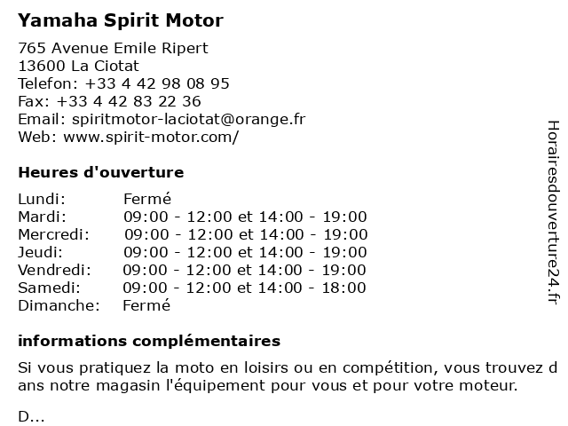 1 Yamaha Motors (Atelier) (Distance: 0,03 km) 87 Avenue Emile Ripert, 13600 La Ciotat atelier, cyclos, maxi-scooter, motors, motos, scooter, yamaha 2 Yamaha Motors (Distance: 7,09 km) . Allee de la Farigoulette, 83270 Saint Cyr sur Mer cyclos, maxi-scooter, motors, motos, scooter, yamaha 3 Yamaha Motors (Atelier) (Distance: 7,09 km) . Allee de la Farigoulette, 83270 Saint Cyr sur Mer atelier, cyclos, maxi-scooter, motors, motos, scooter, yamaha 5 HYUNDAI MOTOR GROUP RACING (Distance: 16,60 km) 2600 Rte 402, 83870 SIGNES group, hyundai, motor, racing 6 Yamaha Motors (Atelier) (Distance: 19,06 km) 373 Route de la Gare, 83190 Ollioules atelier, cyclos, maxi-scooter, motors, motos, scooter, yamaha |