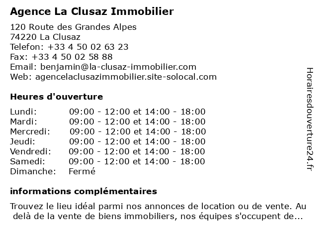 1 AGENCE ALPES IMMOBILIER (Distance: 0,04 km) 92 Route des Grandes Alpes, 74220 La Clusaz agence, alpes, immobilier 2 Cabinet Proalpes Immobilier (Distance: 0,15 km) 33 route de la Piscine, 74220 La Clusaz agence, cabinet, commerces, gestion, immobilier, location, proalpes, transaction, vente 4 Foncia Transaction (Distance: 3,83 km) - Immeuble Le Bellachat Villavit, 74450 Le Grand-Bornand agence, appartement, foncia, gestion, immobilier, location, maison, transaction, vente 5 Century 21 - Aravis Immobilier (Distance: 3,93 km) 28 Place de l'Eglise, 74450 Le Grand-Bornand 21, aravis, century, immobilier 6 4% Immobilier (Distance: 16,38 km) 3 Place villia, 74130 Mont Saxonnex 4%, appartement, immeuble, immobilier, services |
