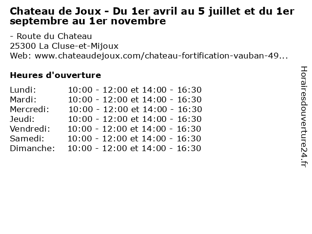 Termes de recherche pour Chateau de Joux - Du 1er avril au 5 juillet et du 1er septembre au 1er novembre:du, et, de, chateau, au, histoire, musée, 1er, art, office, livre, juillet, septembre, ancien, avril, novembre, exposition, joux, monument |