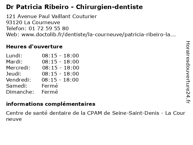 1 Dr Patricia Ribeiro - Chirurgien-dentiste - secrétariat (Distance: 0,00 km) 121 Avenue Paul Vaillant Couturier, 93120 La Courneuve chirurgien, consultation, dentiste, docteur, dr, med, médecin, médecine, patricia, ribeiro, secrétariat, traitement 2 Chez Ribeiro (Distance: 2,02 km) 8 Av Du Cimetiere Parisien, 93500 Pantin chez, luis, restaurants, ribeiro 3 Maître Juliette Ribeiro - Avocat (Distance: 8,33 km) 149 Rue de Rome, 75017 Paris avocat, juliette, justice, lois, maitre, maître, ribeiro 5 Rodrigues Ribeiro Maria De Fatima (Distance: 9,47 km) 6 Rue Jules Ferry, 95400 Villiers Le Bel fatima, maria, restaurants, ribeiro, rodrigues 6 Dr Carine Ribeiro-Creuze - Radiologue (Distance: 12,82 km) 21 Avenue Gambetta, 94700 Maisons-Alfort carine, creuze, dr, médecins, médicaments, radiologue, ribeiro, santé, secrétariat, spécialiste |