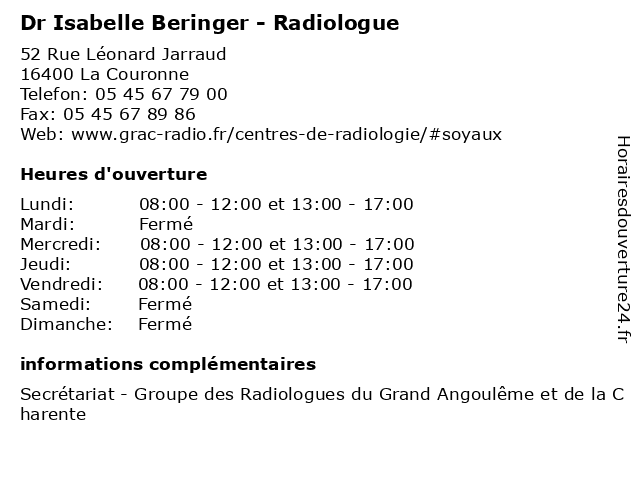 1 Dr Isabelle Beringer - Radiologue (Distance: 5,47 km) 51 avenue du Président Wilson, 16000 Angoulême beringer, consultation, docteur, dr, isabelle, med, médecin, médecine, radiologue, traitement 2 Dr Isabelle Beringer - Radiologue (Distance: 8,24 km) 10 chemin de Frégeneuil, 16800 Soyaux beringer, consultation, docteur, dr, isabelle, med, médecin, médecine, radiologue, traitement 3 Dr Isabelle Rile - Médecin généraliste (Distance: 0,66 km) - Route de Bordeaux, 16400 La Couronne consultation, docteur, dr, généraliste, isabelle, med, medecine, medical, médecin, rile, traitement 4 Isabelle Coiffure (Distance: 0,73 km) 19bis avenue de la Libération, 16400 La Couronne cheveu, coiffeur, coiffure, coloration, coupe, isabelle, mèche 5 Isabelle Giraud - Sage-femme (Distance: 2,31 km) - Rond-Point de Girac, 16000 Angoulême consultation, docteur, dr, femme, giraud, isabelle, med, médecin, sage, traitement 6 Isabelle Azard - Masseur-kinésithérapeute (Distance: 2,31 km) - Rond-Point de Girac, 16000 Angoulême azard, consultation, docteur, dr, isabelle, kinésithérapeute, masseur, med, médecin, traitement |