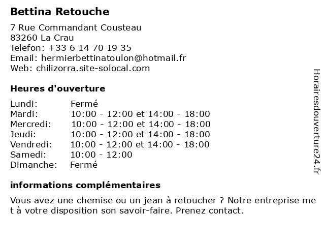 | Mardi | 10:00-12:00 et 14:00-18:00 |