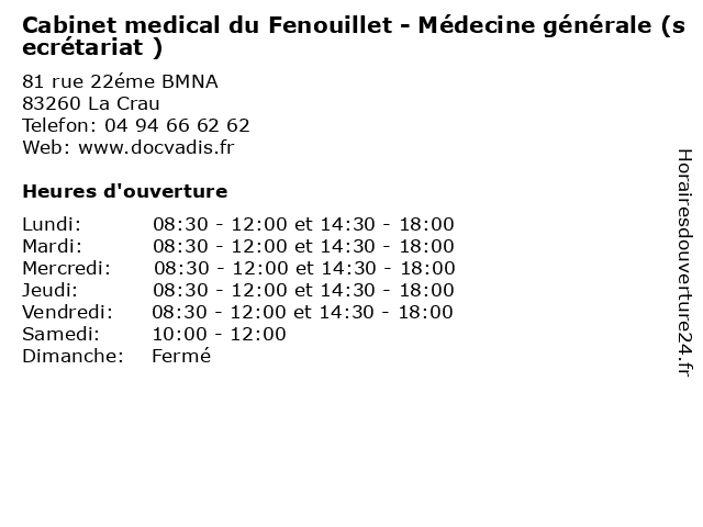 | Lundi | 08:30-12:00 et 14:30-18:00 |