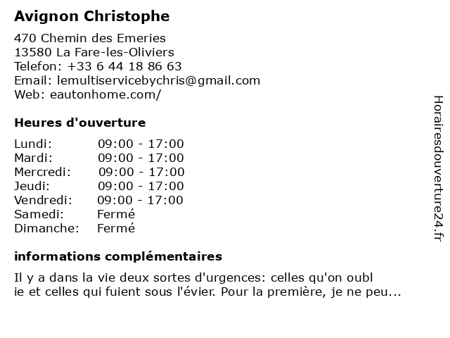 1 Carlotti Christophe (Distance: 2,65 km) 17 Chemin Des Cremades, 13580 La Fare Les Oliviers carlotti, christophe, restaurants 2 Maitres Jean-Sébastien Duracher & Jean-Christophe Roussel - Notaires (Distance: 7,94 km) 2 Place de l'Hôtel de ville, 13340 Rognac christophe, droits, duracher, jean, maitres, maître, notaires, patrimoine, roussel, spécialistes en droits, sébastien 3 Portero Jean Christophe Didier (Distance: 8,06 km) 16 Boulevard Marcel Cachin, 13130 Berre L Etang christophe, didier, jean, portero, restaurants 4 Quesada Christophe Richard (Distance: 10,56 km) 600 Route De Coudoux, 13410 Lambesc christophe, quesada, restaurants, richard 5 Saint Christophe (Distance: 12,36 km) 885 Avenue De l Europe, 13760 St Cannat christophe, face, pile, restaurants, saint 6 Tabac du Pont d'Avignon (Distance: 12,78 km) 376 boulevard Ledru Rollin, 13300 Salon-de-Provence d'avignon, du, e-liquides, electronique, journaux, pont, presse, tabac, vap, vapoteuse |