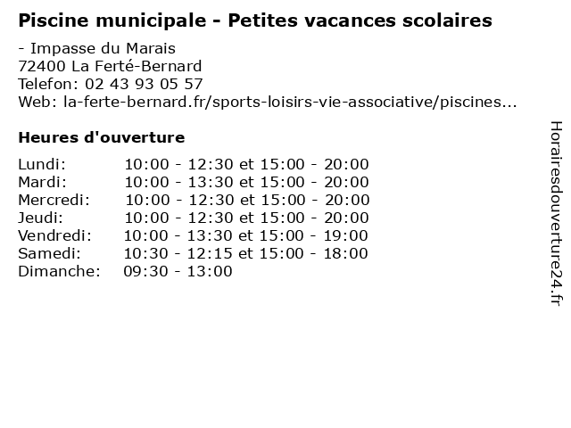 1 Piscine municipale - Périodes scolaires (Distance: 0,00 km) - Impasse du Marais, 72400 La Ferté-Bernard activité, bassins, famille, municipale, natation, piscine, périodes, scolaires, sport 2 Piscine Municipale - Juillet et Août (Distance: 0,20 km) - Avenue de la République, 72400 La Ferté-Bernard activité, août, bassins, et, famille, juillet, municipale, natation, piscine, sport 3 Espace Jeunes (14 -18 ans - Périodes Scolaires) (Distance: 0,41 km) 2 Rue Alfred Marchand, 72400 La Ferté-Bernard 14, 18, activités, ans, espace, jeunes, loisirs, période, périodes, scolaire, scolaires 4 Espace Jeunes (14-18 ans - Vacances Scolaires) (Distance: 0,41 km) 2 Rue Alfred Marchand, 72400 La Ferté-Bernard 11, 13, 14, 18, activités, ans, espace, jeunes, loisirs, scolaires, vacances 5 Piscine H2O.Perche - Petites Vacances (zone B) (Distance: 8,25 km) - Rue Edouard Fournier, 61260 Ceton aqua, aquatique, h2o.perche, petites, piscine, vacances, zone 6 Aire Municipale et Euro-Relais (Borne campings-car) (Distance: 10,69 km) - Rue du Stade, 61130 Saint Germain de la Coudre aire, borne, camping, campings, car, eau, et, euro, municipale, relais, service, stationnement, tourisme, vidange |