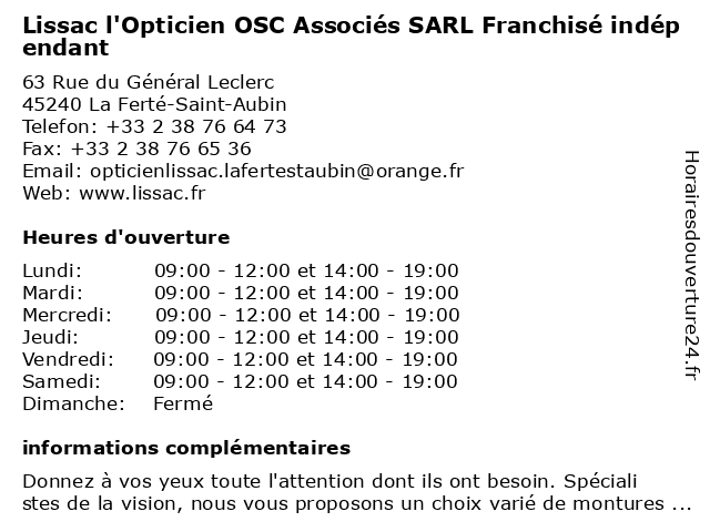 1 Lissac l'Opticien La Ferté-Saint-Aubin - Lunettes de vue, de soleil, lentilles (Distance: 0,00 km) 63 Rue Général Leclerc, 45240 La Ferté-Saint-Aubin aubin, de, ferté, l'opticien, la, lentilles, lentilles de contact, lissac, lunettes, lunettes de soleil, lunettes de vue, opticien, opticien lissac, saint, soleil, vue 2 Opticien La Ferté-Saint-Aubin - Optic 2000 - D. et E. COURTAT (Distance: 0,05 km) 70 Rue Général Leclerc, 45240 La Ferté-Saint-Aubin 2000, aubin, courtat, d., e., et, ferté, la, lentilles de contact, lunettes de soleil, lunettes de vue, optic, optic2000, opticien, opticien optic2000, ray-ban, rayban, saint 3 Isabelle Goncalves-Pellegrin et Caroline Lambert notaires associés (Distance: 16,30 km) 32 Rue Jules Marie Simon, 45160 Olivet associés, caroline, et, goncalves, isabelle, lambert, notaires, pellegrin 4 Opticien Générale d'Optique ORLEANS OLIVET (Distance: 16,95 km) Rue Anthelme Brillat Savarin, 45100 Orléans d'optique, générale, olivet, opticien, orleans 5 Opticien Orléans | Alain Afflelou (Distance: 17,08 km) Zac Expo Sud, 45100 Orléans afflelou, alain, cabinet d'ophtalmologie, magasin de lunettes de soleil, ophtalmologie, opticien, optométrie, orléans 6 Clarisse Bernard et Aurore Joly-Gillette, Notaires Associés (Distance: 18,73 km) 51 Avenue de Saint-Mesmin, 45100 Orléans associés, aurore, bernard, clarisse, et, gillette, joly, notaires |