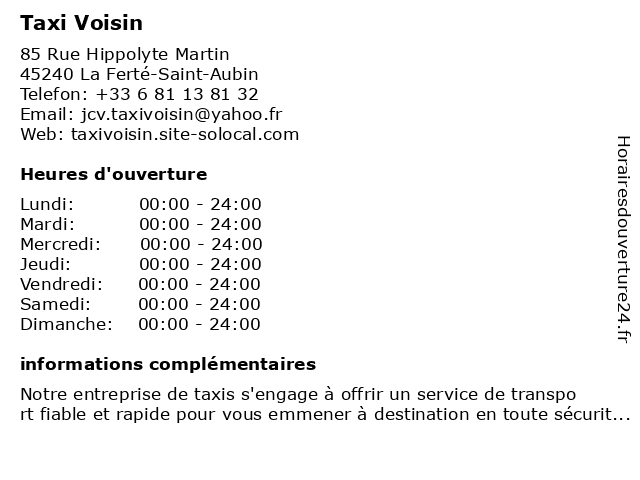 1 Taxi Bella (Distance: 0,46 km) 1000 Chemin de la Croix d'Alvault, 45240 La Ferté-Saint-Aubin bella, taxi 2 Taxi Argault Frédéric Vouzon (Distance: 11,58 km) 33 Rue de la Chapelle, 41600 Vouzon argault, frédéric, taxi, vouzon 4 Taxi du Bourg Lamottois (Distance: 13,50 km) 67 Rue Maurice Genevoix, 41600 Lamotte-Beuvron bourg, du, lamottois, taxi 5 Taxi Le Cerf Lamottois (Distance: 13,97 km) 40 Rue de l'Egalite, 41600 Lamotte beuvron cerf, lamottois, le, taxi 6 |