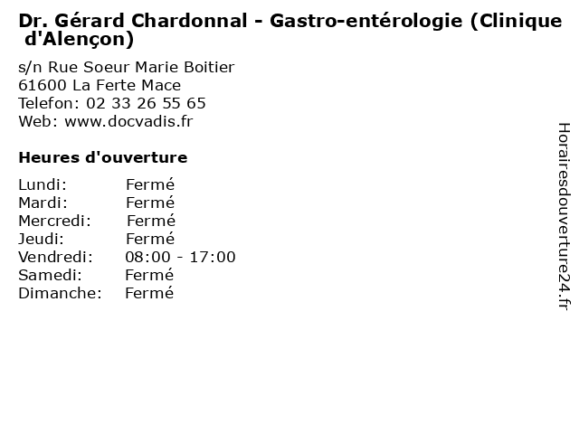 1 Dr. Gérard Chardonnal - Gastro-entérologie (Endoscopies Echographies) (Distance: 0,00 km) s/n Rue Soeur Marie Boitier, 61600 La Ferte Mace chardonnal, consultation, docteur, dr., echographies, endoscopies, entérologie, gastro, gérard, medecins, santé 2 Dr. Gérard Chardonnal - Gastro-entérologie (La Ferté-Macé) (Distance: 0,00 km) s/n Rue Soeur Marie Boitier, 61600 La Ferte Mace chardonnal, consultation, docteur, dr., entérologie, ferté, gastro, gérard, la, macé, medecins, santé 4 Clinique Vétérinaire Vetformance (Distance: 6,63 km) 31 rue du Docteur Joly, 61140 Bagnoles-de-l'Orne chat, chien, clinique, nac, vetformance, vétérinaire 5 UNA - Pays Alençon Perche (Distance: 15,73 km) 8 rue Sainte Marguerite, 61320 Carrouges accompagnement, aides, alençon, pays, perche, services, soins, una 6 Clinique Vétérinaire du Lac (Distance: 19,58 km) 1 ter Grande Rue, 53250 Javron-les-Chapelles chat, chien, clinique, du, lac, nac, vétérinaire |
