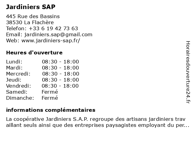 1 Jardiniers SAP La Flachere (Distance: 0,01 km) 445 Rue des Bassins, 38530 La Flachère flachere, jardiniers, la, sap 2 Jardiniers SAP Apremont (Distance: 10,60 km) Route de Lachat, 73190 Apremont apremont, jardiniers, sap 4 Jardiniers SAP Entre Deux Guiers (Distance: 17,04 km) 281 Route du Pont Jean Lioud, 38380 Entre-Deux-Guiers deux, entre, guiers, jardiniers, sap 5 Jardiniers SAP Barberaz (Distance: 18,85 km) Rue de Buisson Rond, 73000 Barberaz barberaz, jardiniers, sap 6 Jardiniers SAP Barberaz (Distance: 19,08 km) 11 Rue de la Concorde, 73000 Barberaz barberaz, jardiniers, sap |