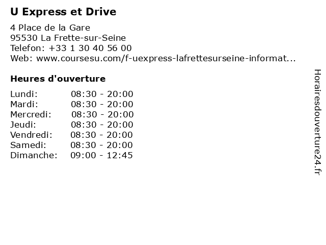 1 U Express et Drive (Distance: 5,59 km) 1 Rue du Haut de la Girouette, 78600 Le Mesnil-le-Roi drive, et, express 2 U Express et Drive (Distance: 11,19 km) 109 Avenue Paul Doumer, 92500 Rueil-Malmaison drive, et, express 5 U Express et Drive (Distance: 12,25 km) 90 Rue Anatole France, 92300 Levallois-Perret drive, et, express 6 U Express et Drive (Distance: 12,78 km) 83 Avenue du Roule, 92200 Neuilly-sur-Seine drive, et, express |