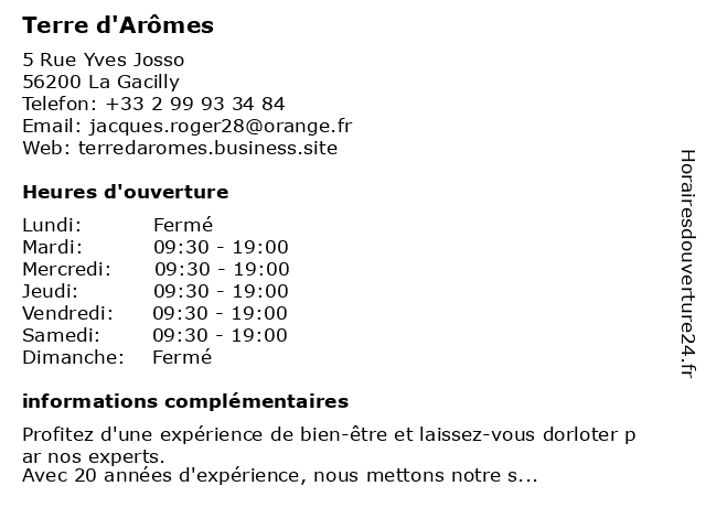 1 Terre de Running (Distance: 11,10 km) 1 Rue Jean Monnet, 35600 Redon accessoires, chaussures, de, mode, running, sports, terre 3 Pharmacie des Arômes (Distance: 26,95 km) 1 Place du Marchix, 56230 Questembert arômes, conseils, des, médicaments, parapharmacie, pharmacie 4 SARL JBLN TP (Distance: 34,70 km) 8 Rue Sabin, 35470 Bain-de-Bretagne assainissement, assainissement et terrassement en ille-et-vilaine, empierrement, jbln, micro station, raccordement, réseaux, sarl, terrassement, tp, travaux publics, évacuation de terre 5 Equivalenza (Distance: 36,63 km) 4 Rue Sainte Catherine, 44160 Pontchâteau arômes, bougies, enveloppes parfumees, equivalenza, mikados, parfums 6 Restaurant Entre Terre et Mer (Distance: 44,90 km) 5 Rue Georges Grignon, 56420 Buléon claudine, entre, et, kersuzan, mer, repas, restaurant, restaurants, terre |