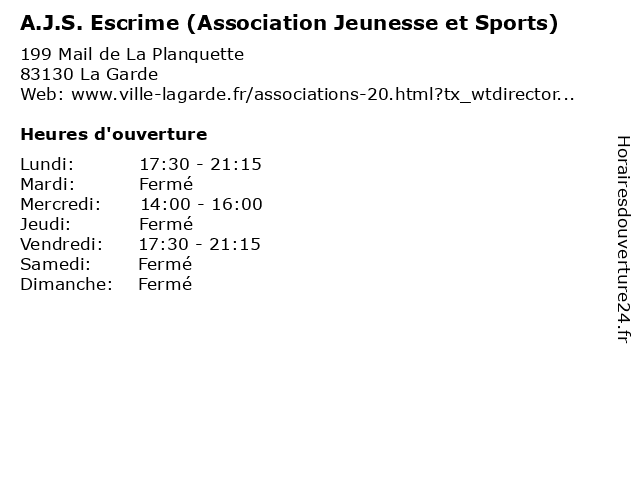 1 A.J.S. (Association Jeunesse et Sports) (Distance: 0,00 km) 199 Mail de La Planquette, 83130 La Garde a.j.s., association, et, jeunesse, public, services, sports 2 A.J.S. Boxe (Association Jeunesse et Sports) (Distance: 0,00 km) 199 Mail de La Planquette, 83130 La Garde a.j.s., association, boxe, et, jeunesse, public, services, sports 3 A.J.S. Fitness Zumba (Association Jeunesse et Sports) (Distance: 0,00 km) 199 Mail de La Planquette, 83130 La Garde a.j.s., association, et, fitness, jeunesse, public, services, sports, zumba 4 A.J.S. Karaté Club Gardéen (Association Jeunesse et Sports) (Distance: 0,00 km) 199 Mail de La Planquette, 83130 La Garde a.j.s., association, club, et, gardéen, jeunesse, karaté, public, services, sports 5 A.J.S. Taëkwondo-Hapkido (Association Jeunesse et Sports) (Distance: 0,00 km) 199 Mail de La Planquette, 83130 La Garde a.j.s., association, et, hapkido, jeunesse, public, services, sports, taëkwondo 6 Maison des Sports (Distance: 0,32 km) . Forsythias, 83130 La Garde des, maison, public, services, sports |