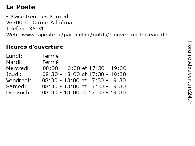 1 La Poste (Distance: 2,60 km) - Le Bourg, 26290 Les Granges-Gontardes agence, assurance, banque, banque postale, bureau de poste, chronopost, colis, courrier, dps, expéditions internationales, la, point, postale, poste, relais, timbres, téléphonie, ups, western union 2 La Poste (Distance: 4,77 km) - Avenue Jean Perrin, 26700 Pierrelatte agence, assurance, banque, banque postale, bureau de poste, chronopost, colis, courrier, dps, expéditions internationales, la, point, postale, poste, relais, timbres, téléphonie, ups, western union 4 La Poste (Distance: 5,72 km) - Le Bourg, 26230 Valaurie agence, assurance, banque, banque postale, bureau de poste, chronopost, colis, courrier, dps, expéditions internationales, la, point, postale, poste, relais, timbres, téléphonie, ups, western union 5 La Poste (Distance: 9,16 km) - Place Frédéric Mistral, 26130 Montségur-sur-Lauzon agence, assurance, banque, banque postale, bureau de poste, chronopost, colis, courrier, dps, expéditions internationales, la, point, postale, poste, relais, timbres, téléphonie, ups, western union 6 La Poste (Distance: 10,19 km) - Place de la Poste, 26230 Chamaret agence, assurance, banque, banque postale, bureau de poste, chronopost, colis, courrier, dps, expéditions internationales, la, point, postale, poste, relais, timbres, téléphonie, ups, western union |