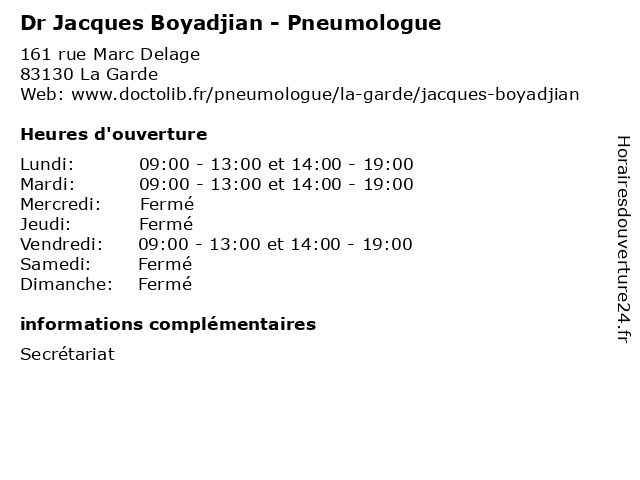 | Lundi | 09:00-13:00 et 14:00-19:00 |
