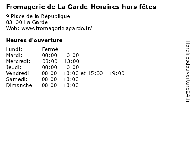 Termes de recherche pour Fromagerie de La Garde-Horaires hors fêtes:la, de, garde, horaires, services, fromagerie, hors, fetes, publics |