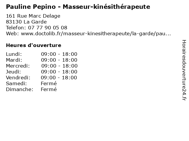 1 École maternelle publique Pauline Roland (Distance: 1,95 km) 65 Avenue Maurin des Maures, 83130 La Garde cours, education, maternelle, pauline, publique, roland, services, école 2 Pauline Cariou - Sage-femme (Distance: 2,35 km) - Place Général de Gaulle, 83160 La Valette-du-Var cariou, consultation, docteur, femme, med, médecin, pauline, sage, traitement 3 Gare de La Pauline-Hyères - Guichet (Distance: 2,52 km) - Avenue Eugène Augias, 83130 La Garde commun, de, gare, guichet, hyères, la, ouigo, pauline, sncf, station, tgv, train, transports 4 Pauline Ramage - Psychologue (Distance: 3,14 km) 266 Chemin de la Bayette, 83220 Le Pradet folie, pauline, psychiatre, psychiatrie, psychiatrique, psychologue, ramage 6 Pauline Goze - Psychologue (Distance: 4,91 km) - Avenue Henri Dunant, 83000 Toulon goze, pauline, psy, psychiatre, psychologue, sante, soins |