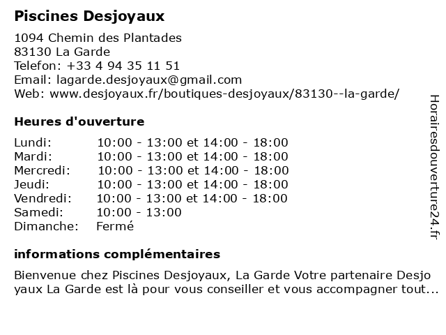 1 Piscines Desjoyaux - Loisirs Piscines 83 (Eté) (Distance: 0,35 km) - Centre Commercial Grand Var Est, 83130 La Garde 83, de, desjoyaux, eté, fitness, loisirs, musculation, piscines, salle, sport 2 Diffazur Piscines (Distance: 1,89 km) 114 avenue Louis Lagrange, 83130 La Garde béton armé, diffazur, piscines, rénovation 3 Piscines Dejoyaux (Distance: 3,97 km) 98 RN, 83160 La Valette du Var boutique, dejoyaux, femmes, hommes, mode, piscines, shopping, shopping center 4 Alliance Piscines Toulon (Distance: 11,00 km) 691 Avenue des Bousquets, 83390 Cuers accessoires, alliance, entretien, installation, piscines, pose, produits, spas, toulon, vente 5 MK PISCINES (Distance: 13,87 km) 13 Rue Jules Ferry, 83390 Pierrefeu-du-Var bâche, entretien piscine, installation locaux technique de piscine, mk, piscines, pompe à chaleur 6 Piscines Hydro Sud (Distance: 13,93 km) s/n Avenue Mozart, 83190 Ollioules construction piscines, filtre, hors, hydro, loisirs, piscines, saison, saisons, sud, toutes |