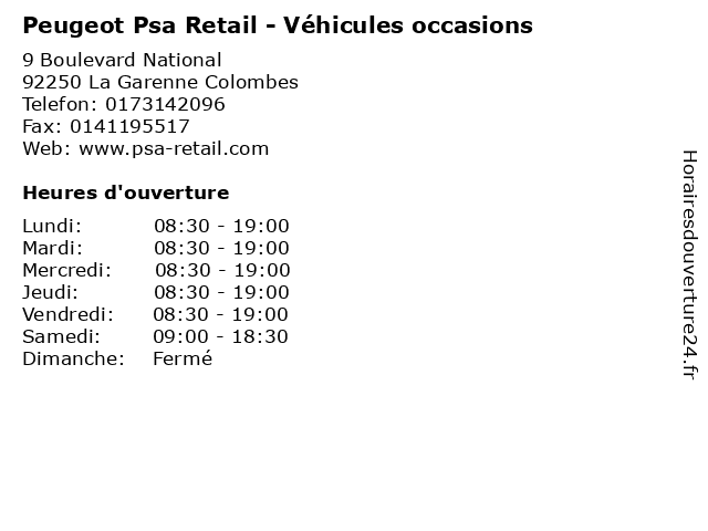 1 Peugeot Psa Retail - Véhicules occasions (Distance: 1,14 km) 115 Rue du 11 Novembre, 92000 Nanterre automobile, commerciale, neuves, occasion, occasions, peugeot, psa, retail, societe, vente, voitures, véhicule, véhicules 2 Peugeot Psa Retail - Véhicules occasions (Distance: 3,20 km) 131 Avenue Charles de Gaulle, 92200 Neuilly-sur-Seine automobiles, concéssionnaire, d'occasion, garage, motos, occasion, occasions, peugeot, psa, retail, véhicule, véhicules 3 Peugeot Psa Retail - Véhicules occasions (Distance: 5,26 km) 39 Rue Saint Didier, 75116 Paris automobiles, concéssionnaire, d'occasion, garage, motos, occasion, occasions, peugeot, psa, retail, véhicule, véhicules 4 Peugeot Psa Retail - Véhicules occasions (Distance: 17,71 km) 97 Avenue Gallieni, 93140 Bondy automobiles, concéssionnaire, d'occasion, garage, motos, occasion, occasions, peugeot, psa, retail, véhicule, véhicules 5 Peugeot Psa Retail - Après vente (Distance: 0,00 km) 9 Boulevard National, 92250 La Garenne Colombes après, concessionnaire automobile, de l'automobile, du service, peugeot, pièces, psa, retail, vente 6 Peugeot Psa Retail - Véhicules neufs (Distance: 0,00 km) 9 Boulevard National, 92250 La Garenne Colombes automobile, concessionnaire, entretien, neuf, neufs, occasion, peugeot, psa, retail, réparation, vente, véhicule, véhicules |