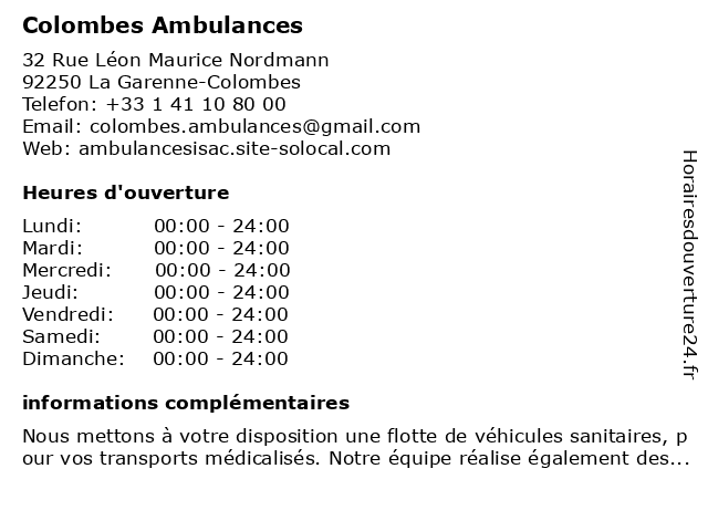 1 Air Assistance Ambulances (Distance: 3,83 km) 102 Rue Henri Barbusse, 95100 Argenteuil air, ambulances, assistance 4 Ambulances De La Cité (Distance: 6,18 km) 8 Rue Jean Poulmarch, 95100 Argenteuil ambulances, cité, de, la 6 Ambulances Larcher 92 (Distance: 7,59 km) 51 Rue Georges Sorel, 92100 Boulogne-Billancourt 92, ambulances, larcher |