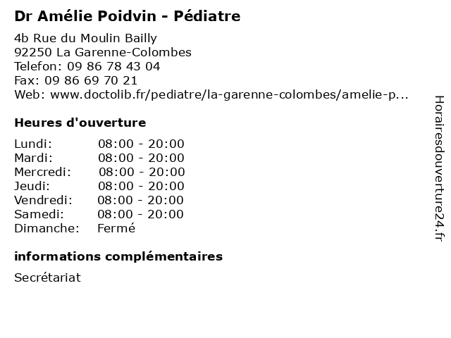 1 Dr Rechwan Saab - Pédiatre (Distance: 0,53 km) 7 Rue d'Estienne d'Orves, 92250 La Garenne-Colombes consultation, docteur, dr, médecins, pédiatre, pédiatrie, rechwan, rendez, saab, santé, sur, vous 2 Dr Sandrine Djoubou Chendjou - Pédiatre (Distance: 0,64 km) 1 Rue du Capitaine Guynemer, 92270 Bois-Colombes chendjou, djoubou, dr, enfant, pediatre, pédiatre, sandrine, sante, soins 3 Amélie Leclerc - Chiropracteur (Distance: 0,89 km) 21 Rue Charles Duflos, 92270 Bois-Colombes amélie, chiropracteur, chiroprateur, chiropraticien, leclerc, sante, soins 4 Dr Kalomoira Kefala - Pédiatre (Distance: 1,16 km) 67 Avenue Foch, 92250 La Garenne-Colombes consultation, docteur, dr, kalomoira, kefala, med, médecin, médecine, pédiatre, traitement 5 Babilou Asnieres Amélie (Distance: 1,53 km) 20 Rue amélie, 92600 ASNIÈRES SUR SEINE amélie, asnieres, babilou 6 Dr Christine Marret Mayaud - Pédiatre (Distance: 1,64 km) 28 Rue Charles Chefson, 92270 Bois-Colombes christine, docteur, dr, generaliste, marret, mayaud, medical, pédiatre, soin |