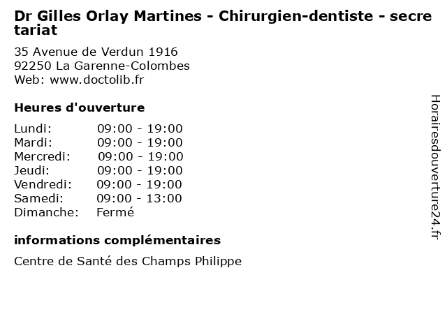1 Dr Gilles Orlay Martines - Chirurgien-dentiste - secrétariat (Distance: 0,00 km) 35 Avenue de Verdun 1916, 92250 La Garenne-Colombes chirurgien, consultation, dentiste, docteur, dr, gilles, martines, med, médecin, médecine, orlay, secrétariat, traitement 2 Medecin Michel Guetta Gilles (Acupuncteur) (Distance: 8,46 km) 50 Avenue de Saxe, 75015 Paris acupuncteur, docteur, gilles, guetta, medecin, michel, sante, services 3 Dr. Gilles Abitbol-Dentiste (Distance: 9,71 km) 76 Rue Jean Jaurès, 92170 Vanves abitbol, consultation, dentiste, docteur, dr., gilles, santé 4 Dr Jean-Philippe Martines - Chirurgien-dentiste (Distance: 11,15 km) 14 Rue de Saint-Prix, 95602 Eaubonne chirurgien, consultation, dentiste, docteur, dr, jean, martines, med, médecin, médecine, philippe, traitement 5 Dr. Gilles Bismuth - Dentiste (Distance: 12,50 km) 61 Avenue a Briand, 93240 Stains bismuth, dentiste, docteur, dr., gilles, medecins, sante 6 Dr. Gilles Pialoux - Infectiologie (Distance: 13,02 km) 4 de la chine, 75020 Paris consultation, docteur, dr., gilles, infectiologie, pialoux, santé |