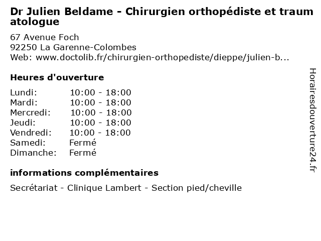 1 Dr Julien Beldame - Chirurgien orthopédiste et traumatologue (Distance: 8,55 km) 136 Rue Blomet, 75015 Paris beldame, chirurgie, chirurgien, dr, et, general, julien, orthopédiste, soins, traumatologue 2 Dr Abdellah Hilaneh - Chirurgien orthopédiste et traumatologue (Distance: 0,00 km) 67 Avenue Foch, 92250 La Garenne-Colombes abdellah, chirurgien, consultation, docteur, dr, et, hilaneh, med, médecin, médecine, orthopédiste, traitement, traumatologue 3 Dr Kamal Haoudi - Chirurgien orthopédiste et traumatologue (Distance: 0,00 km) 67 Avenue Foch, 92250 La Garenne-Colombes chirurgien, consultation, docteur, dr, et, haoudi, kamal, med, médecin, médecine, orthopédiste, traitement, traumatologue 4 Dr Mayalen Lamerain - Chirurgien orthopédiste et traumatologue (Distance: 0,05 km) 63 Avenue Foch, 92250 La Garenne-Colombes chirurgien, dr, et, lamerain, mayalen, orthopédiste, traumatologue 5 Dr Jean David Werthel - Chirurgien orthopédiste et traumatologue (Distance: 1,94 km) 53 Rue Victor Hugo, 92400 Courbevoie chirurgien, david, dr, et, jean, orthopedie, orthopédique, orthopédiste, trauma, traumatologie, traumatologique, traumatologue, werthel 6 Dr Mayalen Lamerain - Chirurgien orthopédiste (Distance: 1,94 km) 53 Rue Victor Hugo, 92400 Courbevoie chirurgien, consultation, docteur, dr, lamerain, mayalen, med, médecin, médecine, orthopédiste, secrétariat, traitement |